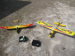 Man, that did not take as long as I thought it would to destroy both airplanes. On takeoff the big one popped off one of the rubber bands that holds the wing on, which caught in the prop and brought her down. Then I forgot to pull the antenna out of the controller so the engine cut out and she crashed again. The final crash was a fence that got in the way and tore the tail off. No problem, I got the other one...problem is it was too windy and the little guy met the same fence head-on. It was then that I realized that I was standing in an anthill. Ow. Better luck next time.